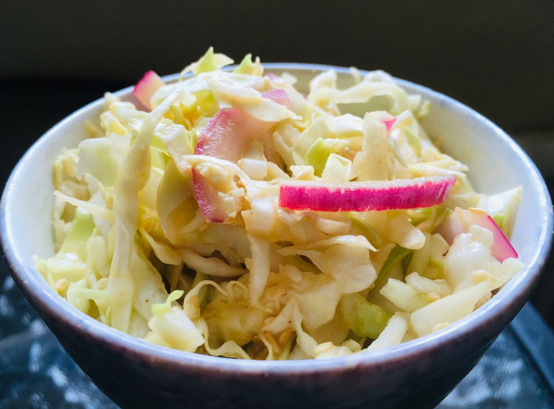 Toast the sesame seeds in a dry frying pan (I use cast iron) until golden brown and set aside. Combine the lime, garlic, vinegar, tamari, tahini, maple syrup and ginger in a small bowl and whisk together. Place the sliced onions in the bowl and let them marinate for about 15 minutes. Add the onions and dressing to the shredded cabbage and sesame seeds in a larger bowl and toss until the cabbage is well coated. Chill until ready to serve. Serves about 4. (Be sure to use it within a day or so as the vinegar will start to immediately saturate and break down the cabbage.)
