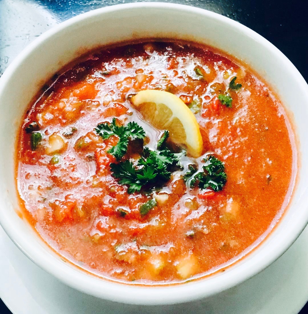 In a food processor or blender blend the tomatoes, tomato juice, olive oil, and garlic into a chunky-smooth puree and pour into a large bowl. Add the sherry, vinegar, seasonings and spices. Place the pepper, onion, cucumber, and parsley in the processor and pulse into finely chopped chunks. Fold them into the bowl and chill your soup at least an hour to get it cold and let the flavors get it on. Add salt and/or pepper (or tabasco!) to taste, and serve garnished with lemon and parsley. It’s well paired with a nice big hunk of peasant bread, although I’ll often mix my cuisines and have it with tortilla chips. Serves about 4 (about 4 cups).
