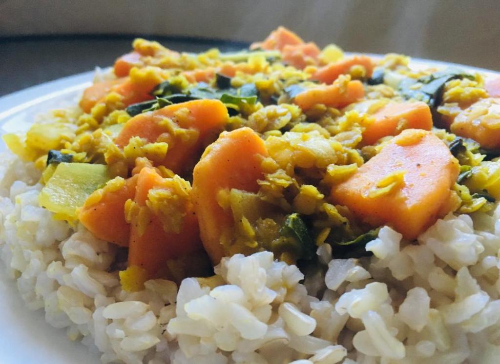 So this fall-appropriate, warming dish utilizes both the British colonial appropriation known as curry powder and the more authentically Indian garam masala (warm spice blend) to currify those ultimate seasonal comfort tubers known as sweet potatoes. Here in the U.S., what get sold as garnet yams are really just red sweet potatoes, so I’m not referring to them as yams, but you may have to look for them under that name. Using red sweet potatoes and red lentils together with the turmeric-colored curry powder and the dark greens makes this dish really pop as an autumn-toned feast for the eye. The lentils also add some texture and “meatiness” to the sauce. What you get is a sweet-creamy-spicy comfort curry perfect to curl up with on a chilly fall night. I’ve used both spinach and chard in this, and they’re both delish. You can vary the greens according to availability, or whatever your preference happens to be in the heat of the moment.