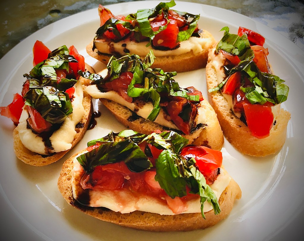 I determined how to make vegan margherita (caprese) bruschetta when it turned out to be the favorite appetizer of un signore who could get me to dress up like a Wookiee and bark like a seal if he so desired. Everybody’s got to serve somebody, as a certain American bard once wrote, and this crunchy-creamy-acidic-basilicious aperitivo is one thing you can serve to the sternest of masters (or mistresses) to their begrudging pleasure.
