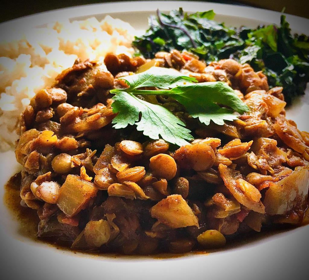 Ethiopian lentils are usually served on spongy injera bread, the Moroccan dish can go solo or with rice, so here I served mine with some sauted and lightly seasoned red kale and a side of brown rice (garnishing the lentils with cilantro, of course). Feel free to get creative – Mr. Wat and his paramour won’t care what else is happening on the plate as long as they’re happily enmeshed.