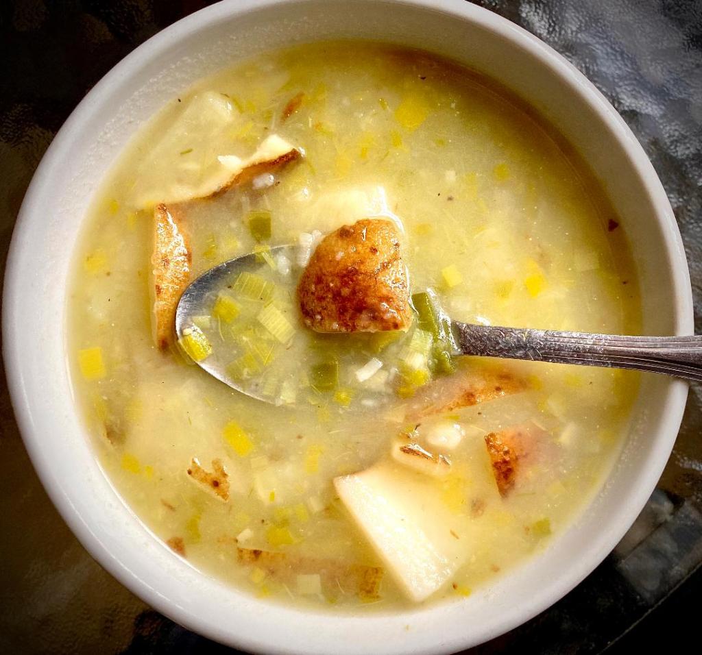 Soak the sliced leeks in a bowl of water to separate them and remove the sand, which will sink to the bottom. They can sit while you chop the potatoes and heat the olive oil on low-medium in a soup pot or dutch oven. Fish out the leeks with a slotted spoon – it’s fine to get some water in the pot – and add them to the oil with 1/2 tsp of the salt, stirring to coat and saute them for a few minutes until they start to soften. Add the potatoes, the rest of the salt, and several turns/dashes of the pepper and toss thoroughly with the leeks before lowering the heat and covering them for 5-10 minutes to cook. Add the 6 cups of water and bring to a boil, then lower the heat and simmer for 30-40 minutes or until the potatoes are soft. You can use a wooden spoon or spatula to smash some potatoes against the side of the pot to thicken the broth; since I’ve had a mini blender, I just take out a couple of cups and puree it before adding it back into the pot. Add more pepper (and salt if you want it) to taste, and serve at the pleasure of your household proletariat. Leftovers will keep a few days in the refrigerator, and they freeze well.