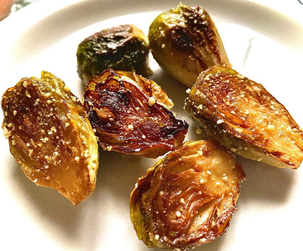 Preheat the over to 425 degrees F. After washing the Brussels sprouts, cut off the tough end part of the stem, pull off any loose or dirty outer leaves, and slice them in half. Combine the olive oil, garlic, salt, and pepper, and toss with the sprouts. Place the sprouts cut side down on a baking sheet and bake them for about 20 minutes, then flip them over and bake another 15-20 minutes or so, until nicely caramelized and crispy outside. Toss them piping hot with the balsamic vinegar and then sprinkle them with the cashew “cheese” before serving. In the unlikely event that you have leftovers, re-roast them on a baking sheet rather than microwaving them to heat them up.